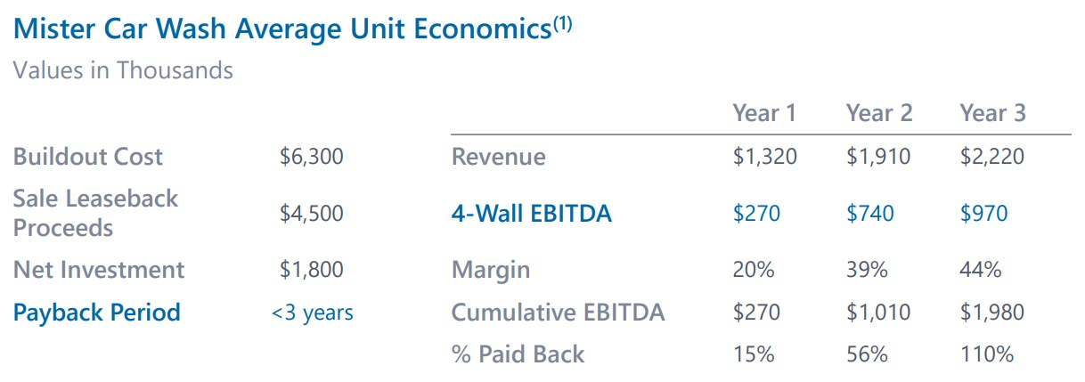 Как видно из таблицы ниже, инвестиции Mister Car Wash в новые локации окупаются в течение трех лет. Продажа построенного объекта с обратной арендой (Sale-Leaseback) является ключевым инструментом для быстрого возмещения инвестиций, поскольку позволяет частично высвободить капитал и снизить чистый объем вложений в новую локацию.