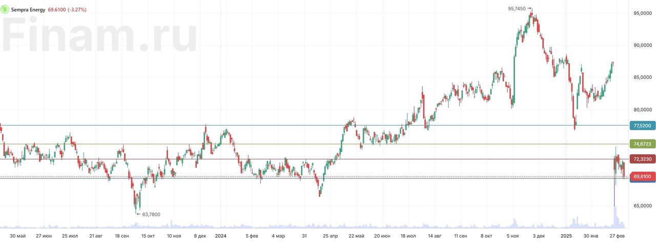 С точки зрения технического анализа после февральского снижения акции Sempra нашли поддержку на уровнях начала 2023 года. Преодоление сопротивления в районе $72 может открыть путь к дальнейшему росту, с ближайшей целью на отметке $74,7.