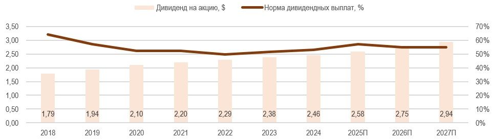 Стабильно растущие дивиденды. Руководство Sempra планирует в 2025 году выплатить дивиденды в размере $2,58 на акцию, что на 4% выше показателя 2024 года. Коэффициент выплат в ближайшие годы будет на относительно низком уровне, в диапазоне 50–60%, это обусловлено обширной инвестпрограммой. Таким образом, дивидендная доходность акций Sempra может составить 3,7%, т. е. выше среднего значения по электроэнергетическому сектору США.