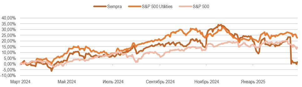 Менеджмент Sempra ожидает ускорения темпов роста чистой прибыли в среднесрочной перспективе. Финансовые результаты компании за 2024 год оказались слабыми: скорректированная чистая прибыль на акцию (EPS) выросла всего на 0,87% г/г, до $4,65. На слабую динамику EPS оказали давление снижение доходов Sempra Infrastructure из-за меньших объемов транспортировки газа и снижения генерации ВИЭ, а также рост процентных расходов. Кроме того, руководство Sempra существенно понизило прогноз EPS на 2025 год — с $4,90–5,25 до $4,30–4,70, что связано с неблагоприятным решением калифорнийского регулятора по тарифам для SDG&E и SoCalGas. Менеджмент считает текущие трудности временными и ожидает ускорения роста скорр. EPS до 7–9% в долгосрочной перспективе, это заметно выше средних темпов роста американских электроэнергетических компаний.