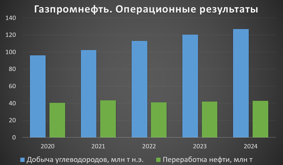 Газпром нефть не публиковала операционных результатов с 2022 года. Но за 2024 год появилась сокращенная информация. Добыча углеводородов выросла на 5% год к году. А объем переработки прибавил 1%.