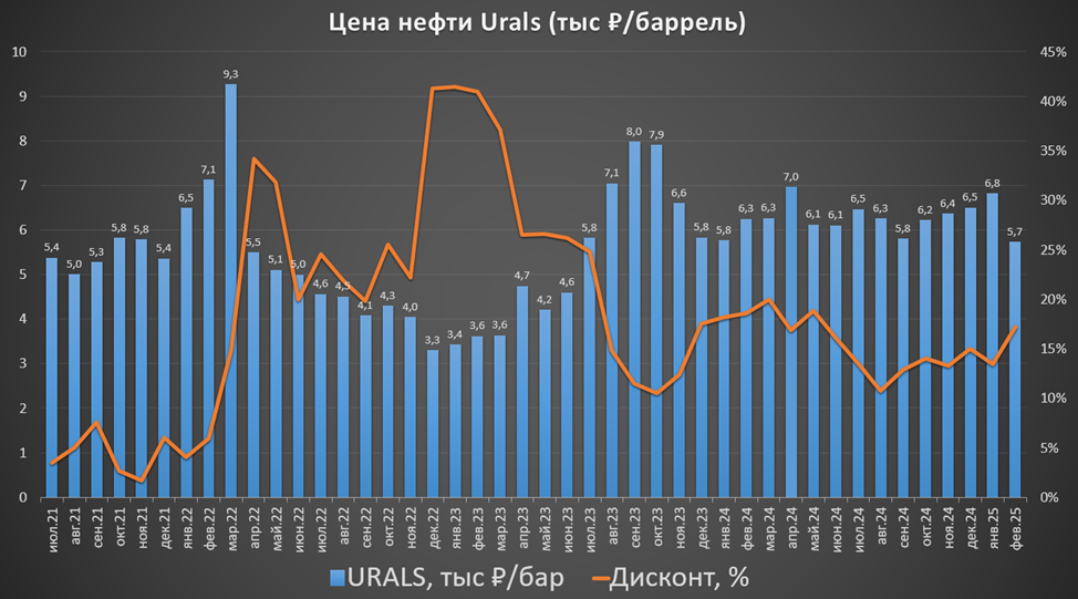 Нефть марки Urals торгуется с дисконтом к BRENT. Сейчас он в районе 15%. Средняя цена Urals в 2024 году составила около 6,3 тысяч ₽ за баррель. Это в 1,5 раза выше г/г. Также отмечу, что рублевые цены Urals в феврале 2025 года минимальные за 1,5 года из-за падения цен на нефть и укрепления рубля.