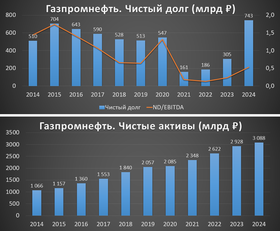 В прошлом году было 2 выплаты за 2023 год 102,43₽ на акцию. И за первую половину 2024 года: 51,96₽. Суммарно на эти цели ушло 732 млрд. Это составило 75% прибыли и 130% свободного денежного потока за этот период. Это основная причина роста долговой нагрузки.