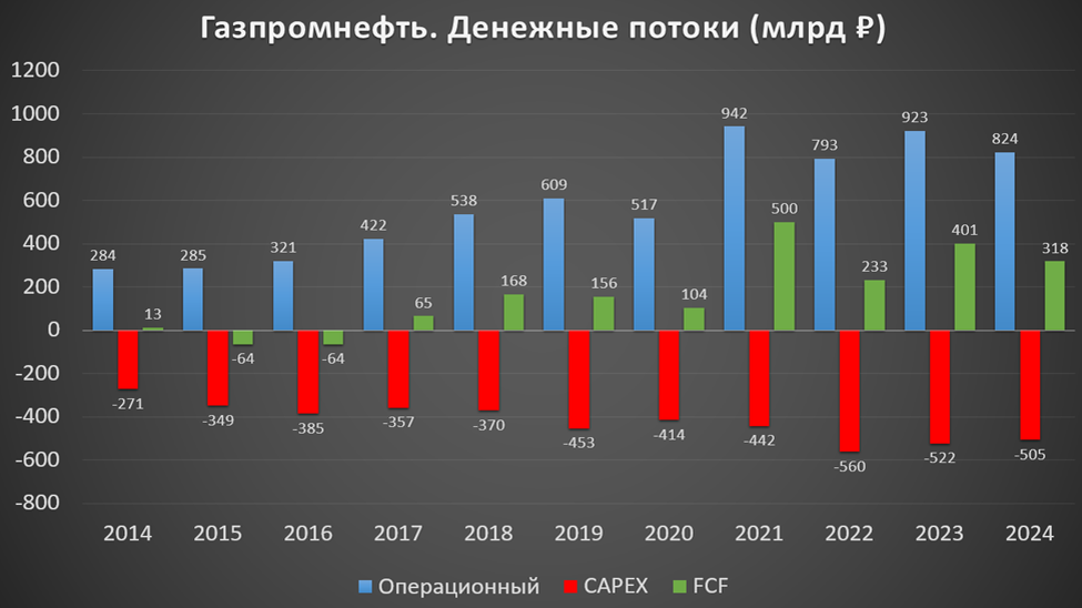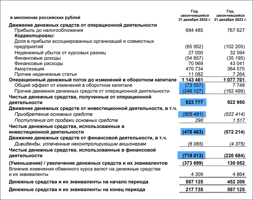 операционная деятельность 824 млрд (-11% г/г). Снижение в основном из-за изменений в оборотном капитале.