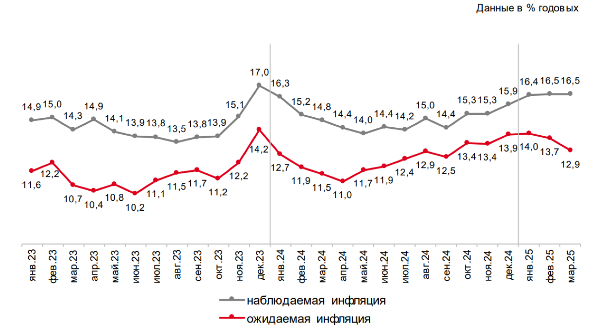 Между тем ожидания населения по инфляции на год вперед снизились до 12,9%. Это минимальное значение с сентября 2024 года.
