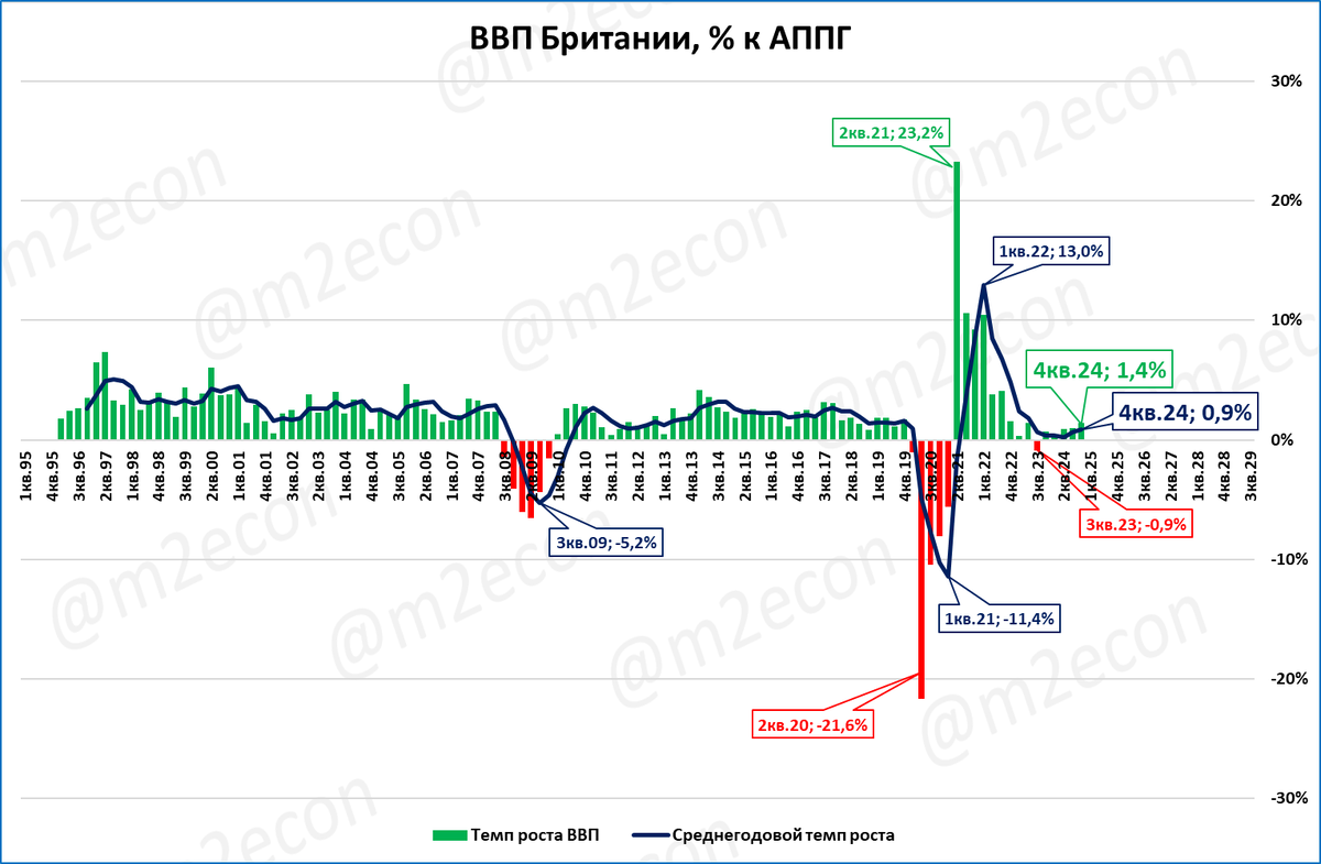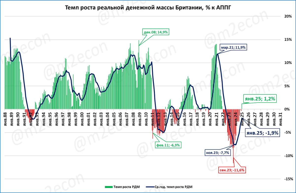 В Британии начался рост реальной денежной массы после трёх лет падения подряд. Можно ожидать, что после роста на 0,9% в 2024 году, в 2025 году ВВП вырастет на 1,2%.