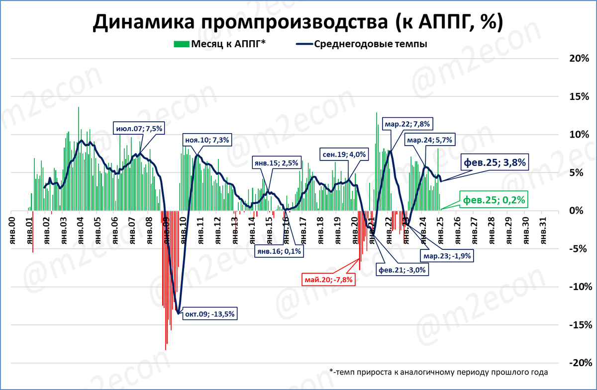 Промпроизводство в феврале выросло на 0,2%. Определённое влияние (в сторону занижения) мог оказать календарный эффект: в феврале 2025 года на один календарный день меньше, чем в 2024.