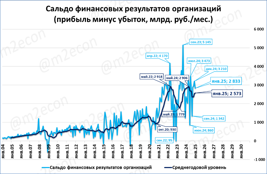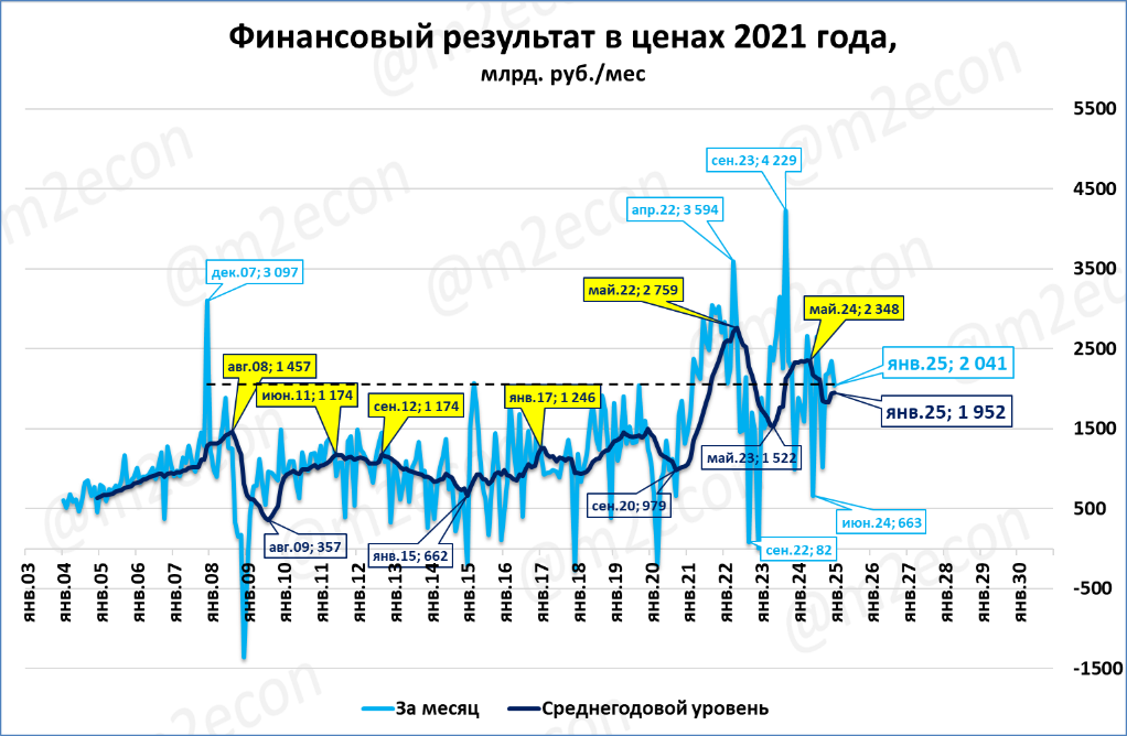 В ценах 2021 года прибыль в январе тоже приличная, 2,04 трлн рублей.