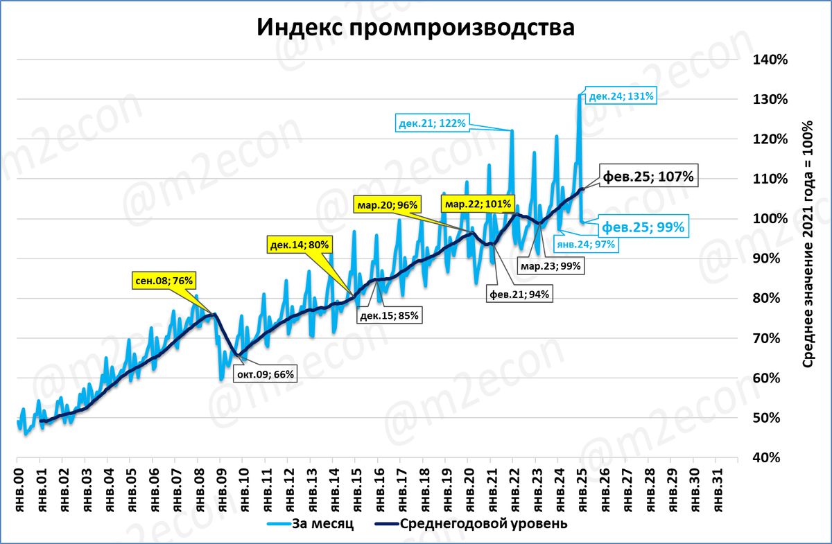 В феврале 2025 года промышленное производство составило 99% к среднемесячному уровню 2021 года.