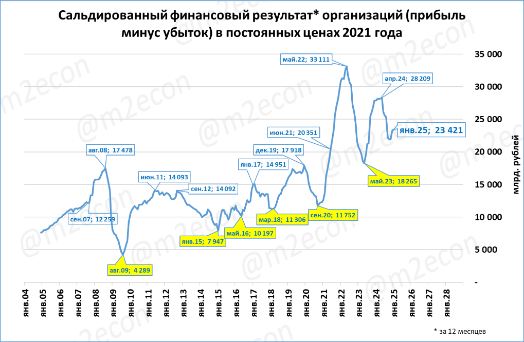 Прибыль за последние 12 месяцев (скользящий год) составила 23,4 трлн рублей в ценах 2021 года.
