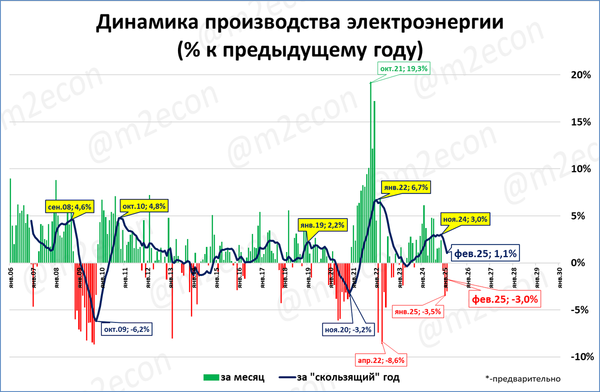 Производство электроэнергии относится к непрерывным производствам. Поэтому сравнение нынешнего «обычного» февраля с високосным 29-дневным февралём прошлого года автоматически может давать занижение на 3,6%.