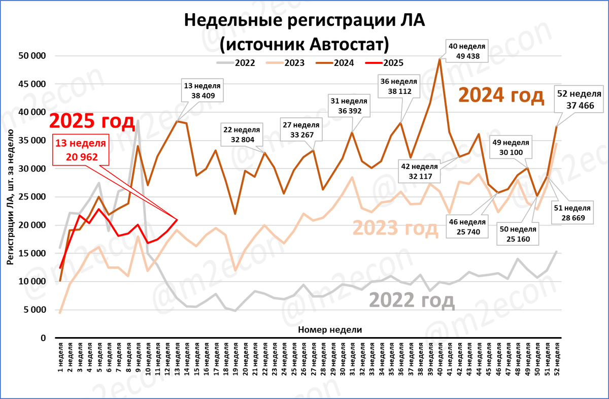Далее этот эффект сравнительной базы будет постепенно ослабевать, пока вновь не проявится в сентябре-октябре. В 2024 году в эти месяцы наблюдались повышенные регистрации из-за повышения утильсбора. Это видно по пику на 40-й неделе на графике недельных регистраций.
