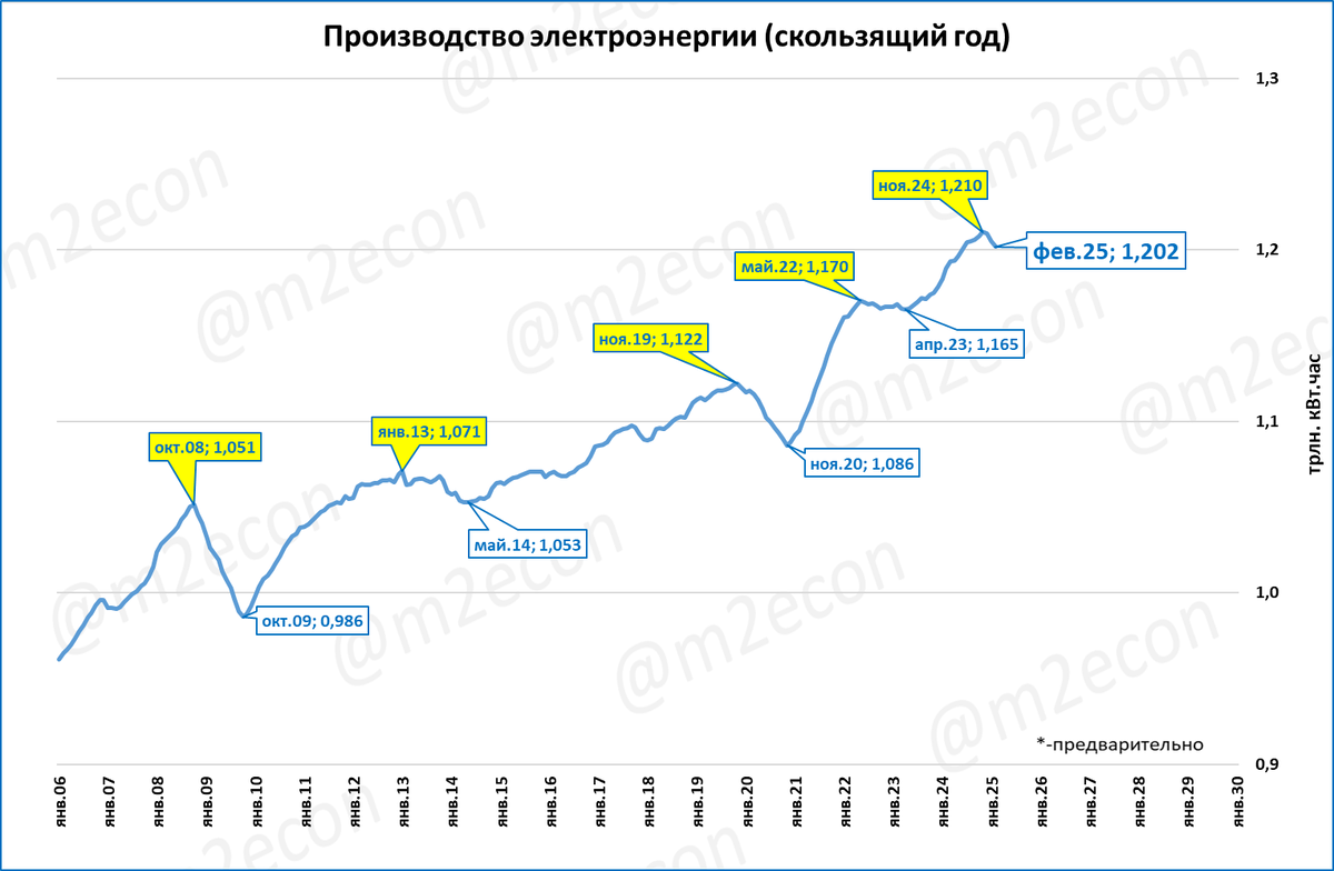 За последние 12 месяцев (скользящий год) было произведено 1,2 трлн. кВт.часов электроэнергии.