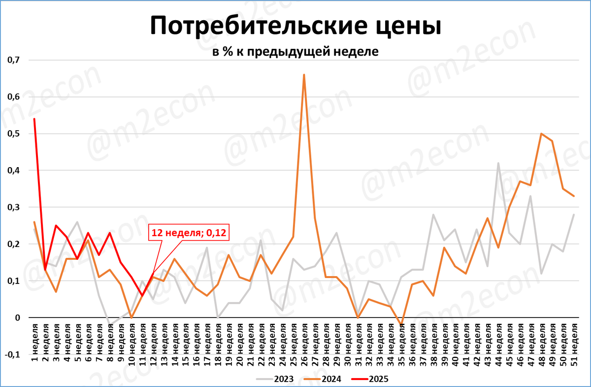 Инфляция на 12-й неделе (0,12%) чуть выше инфляции 12-й недели 2024 года (0,11%).