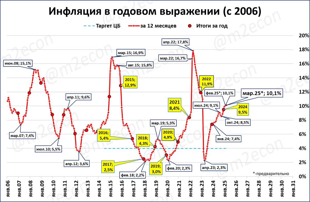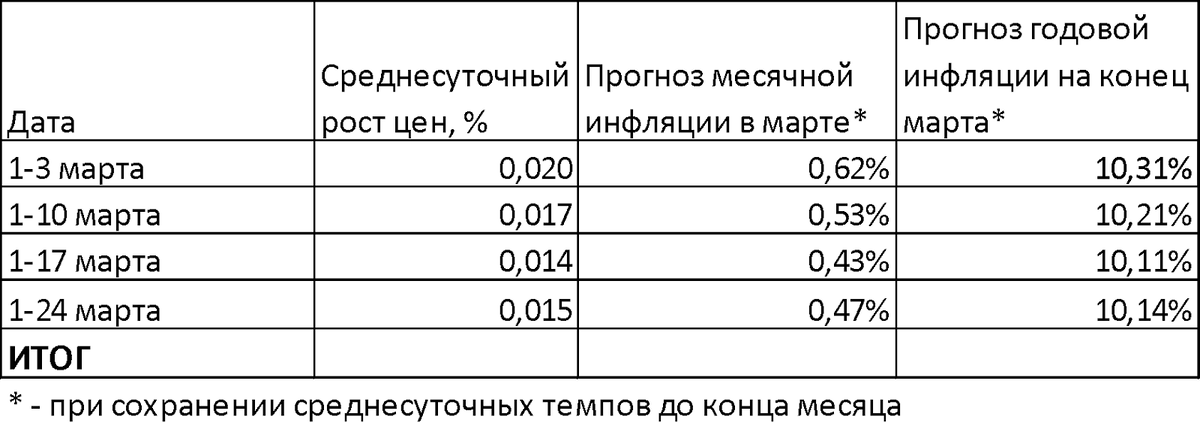 Если такие темпы сохранятся до конца месяца, то по итогам марта инфляция составит 10,1% годовых. По сравнению с 10,1% по итогам февраля это стабилизация и остановка роста.