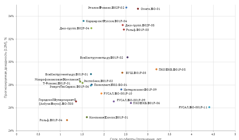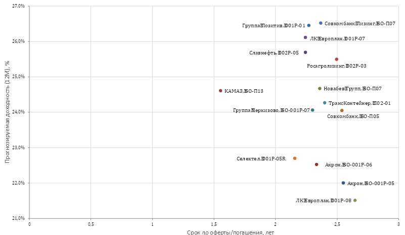 Наглядным примером привлекательности краткосрочных флоатеров является выпуск Ростелекома серии 001Р-12R. При погашении в апреле 2026 года ожидаемая доходность составит 22,7%, в то время как по выпуску эмитента серии 001Р-14R с фиксированным купоном и тем же сроком до погашения доходность равна лишь 20,3%. В нашем покрытии уже есть выпуск АЛРОСА серии 001Р-02, и, на наш взгляд, он выглядит наиболее привлекательным из корпоративных флоатеров привязанных к КС из эмитентов первого эшелона, особенно на замену краткосрочным фиксам.