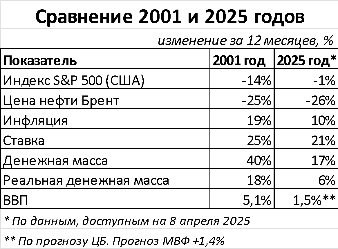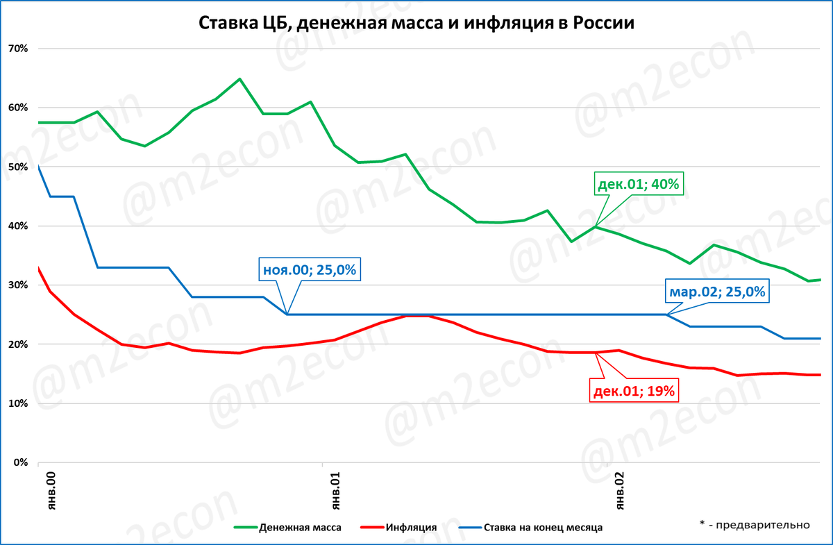 Высокие ставки. Все 2000-е годы ЦБ придерживался политики высоких ставок, выше годовой инфляции. Поэтому в 2001 году повышение ставок не потребовалось. Ставка была 25% (выше, чем сейчас). ЦБ просто на полтора года (с ноября 2000 по март 2002) приостановил снижение ставки, проводившееся ранее.