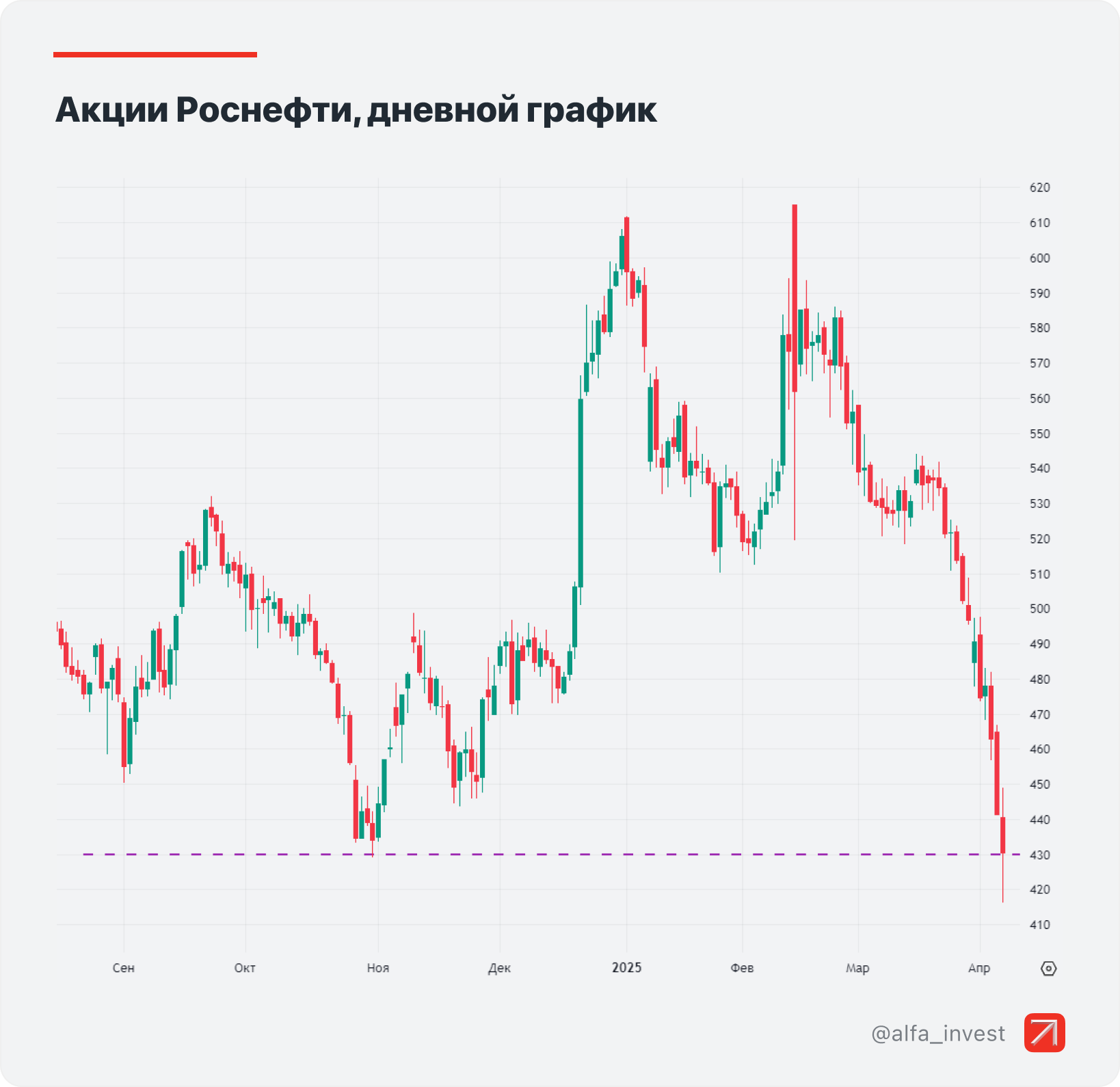 Бумаги Роснефти активно падают на фоне распродаж на мировых рынках. Сегодня, 7 апреля, стоимость акции опускалась до 416 руб. — это минимум с мая 2023 года. В целом текущие уровни сопоставимы с ценами просадки осенью прошлого года, когда Роснефть возобновила программу байбэка.