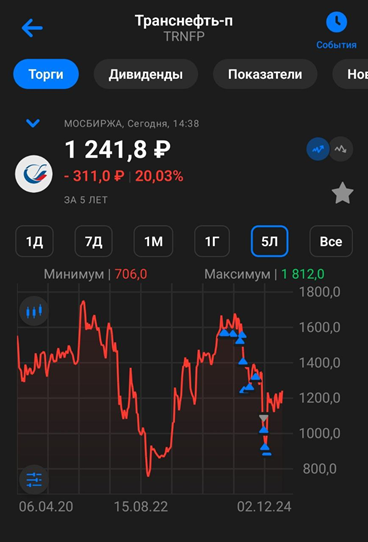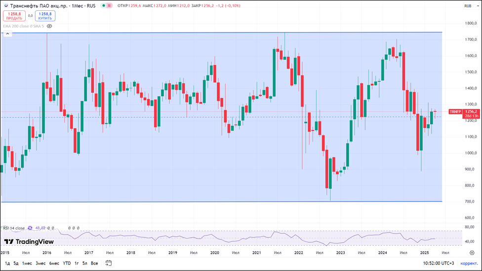 На Московской бирже торгуются привилегированные акции Транснефти. С максимумов прошлого года котировки снизились примерно на четверть. И на данный момент находятся на средних за последние 10 лет уровнях.