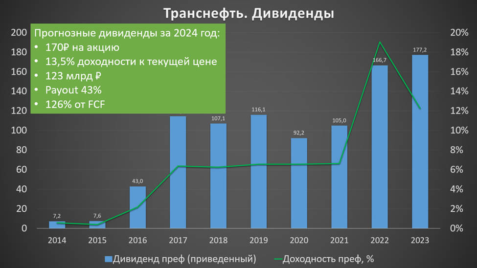 Дивиденды за 2023 год составили 177,2₽. Доходность более 14% к текущей цене акций.