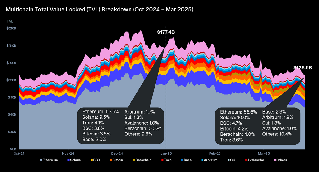 Доля Ethereum обвалилась с 63,5% до 56,6% ($112,6 млрд до $72,7 млрд). Потери Solana и Base в абсолютном выражении достигли 23,5% и 15,3% соответственно.