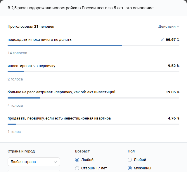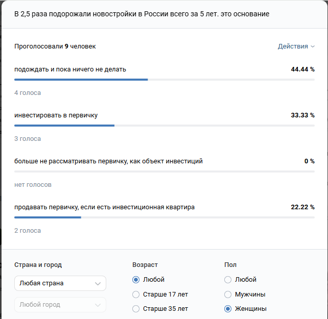 В полтора раза различается количество голосов по пункту «подождать и не покупать первичку», а количество голосов по пункту инвестировать у женщин в 3 раза больше этого показателя у мужчин! Это очень сильная иллюстрация гендерного отличия при поведении инвестора. Здесь работает эвристика доступности. В ранее проведённых исследованиях очень много подобных иллюстраций с финансовых рынков.