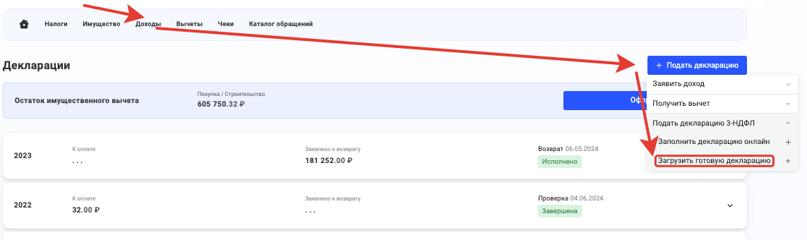 Сохранить файл xml из программы и отправить его можно через личный кабинет налогоплательщика. Кнопка для загрузки 3-НДФЛ находится, если пройти по пути «Доходы» — «Декларации» — «Подать декларацию 3-НДФЛ» — «Загрузить готовую декларацию». Перед загрузкой декларации и дополнительных документов выберите год, за который она подается.