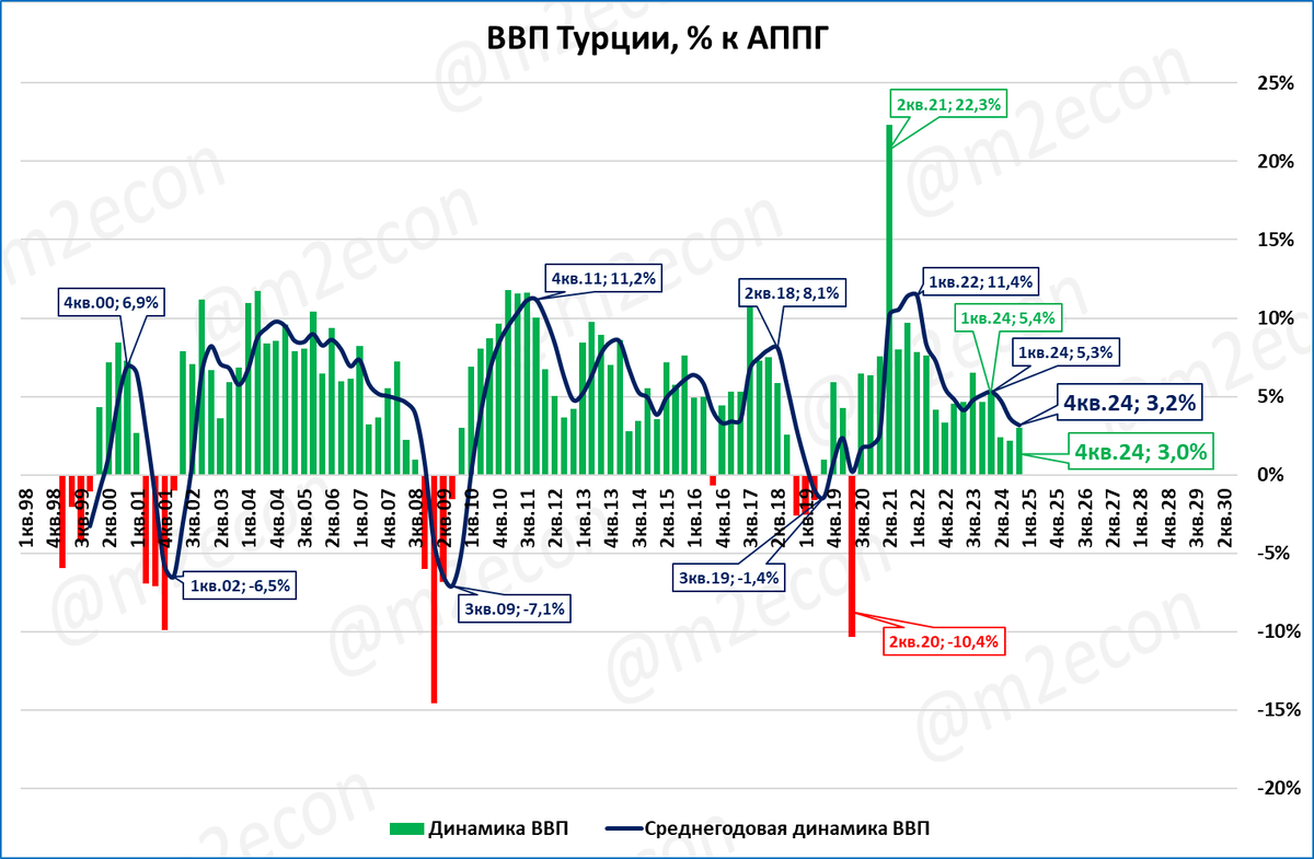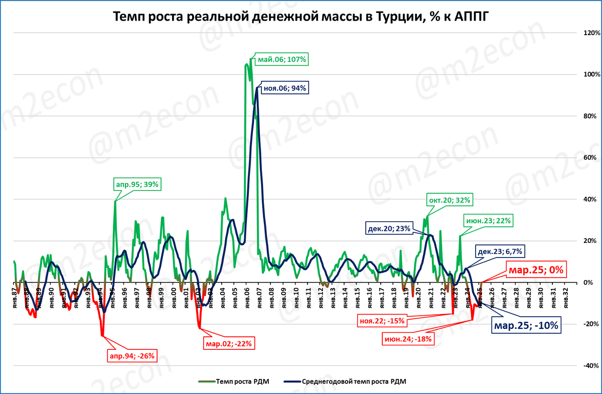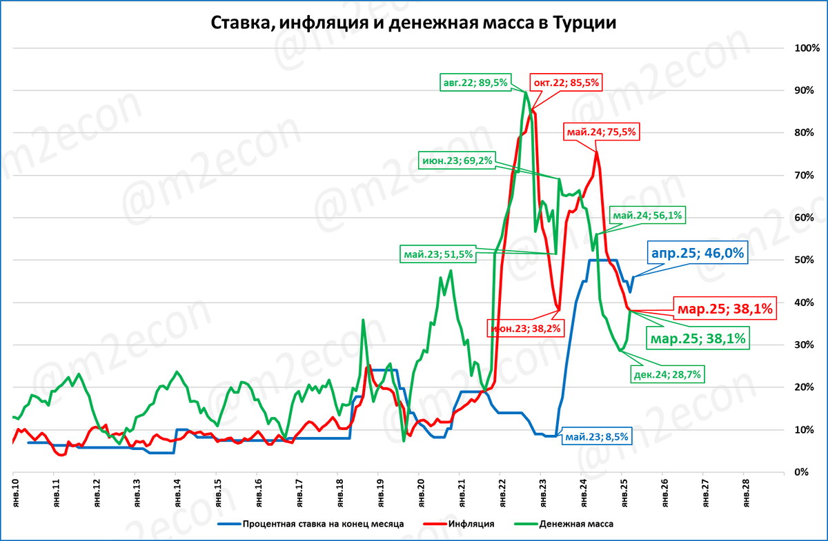 Во-первых, ЦБ Турции вместо ошибочных снижений ставки повысил ставку впервые с 2023 года. Правда, турецкий ЦБ объясняет это не необходимостью побороть высокую инфляцию (было бы правильно), а возросшей неопределённостью в связи с начавшимися торговыми войнами.