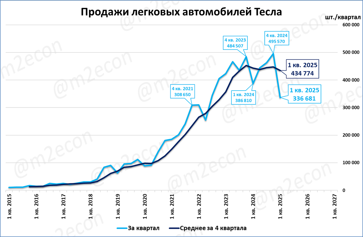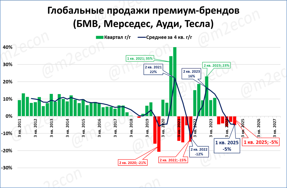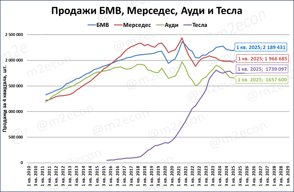 В 1 квартале 2025 года продажи автомобилей четырёх марок (Ауди, БМВ, Мерседес и Тесла) составили 1,7 млн. единиц.