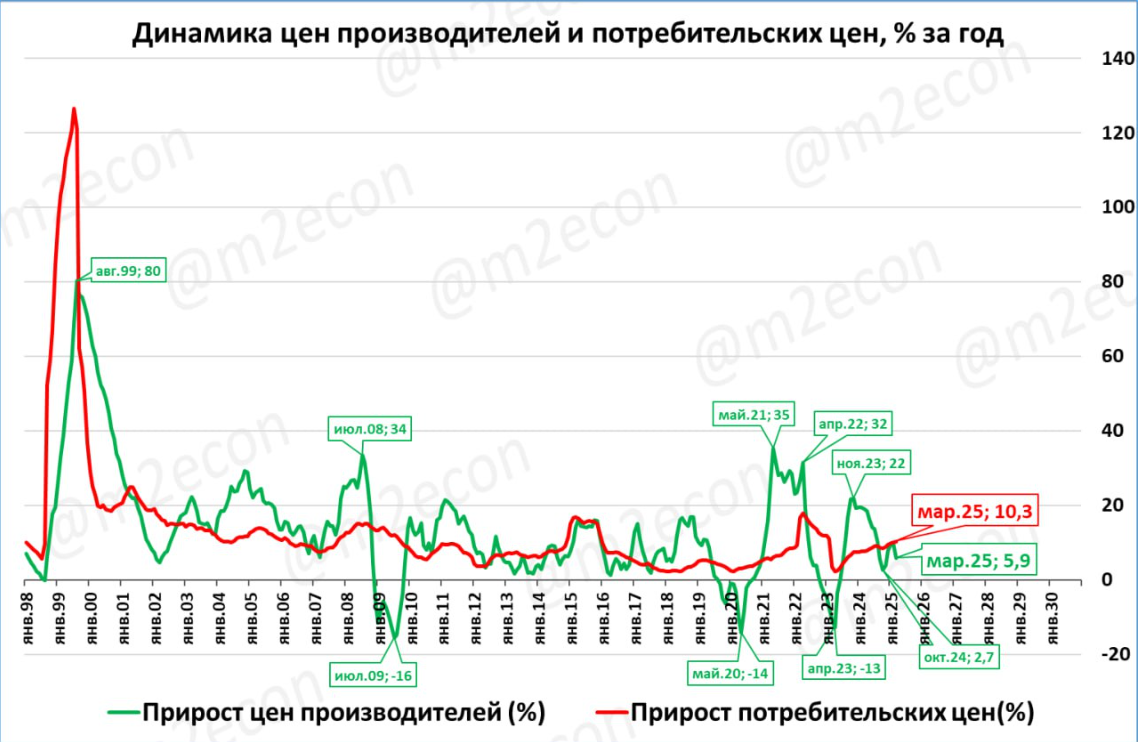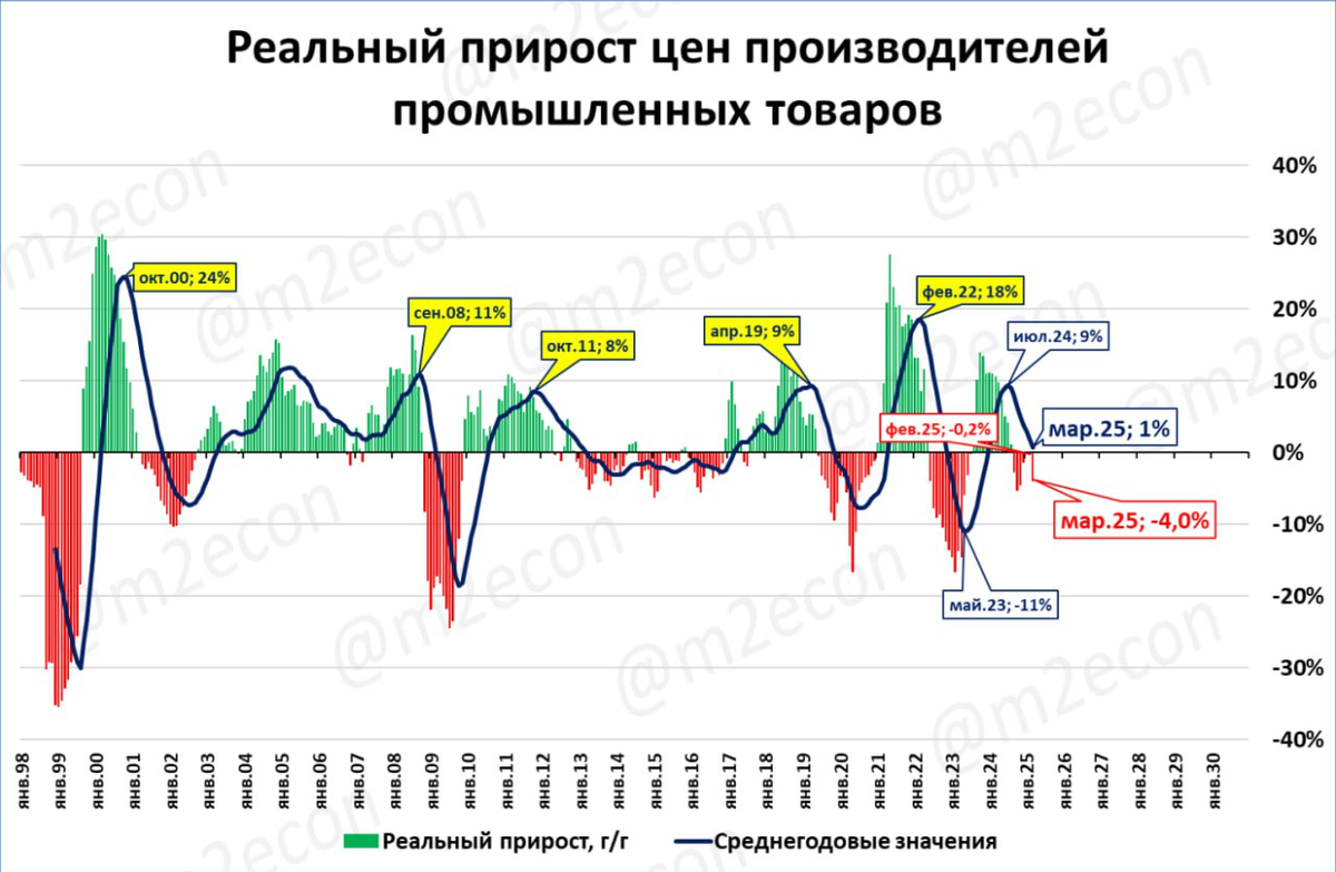 Обратите внимание: все кризисы в России (1998, 2008, 2015 и др.) сопровождаются падением цен производителей в реальном выражении.