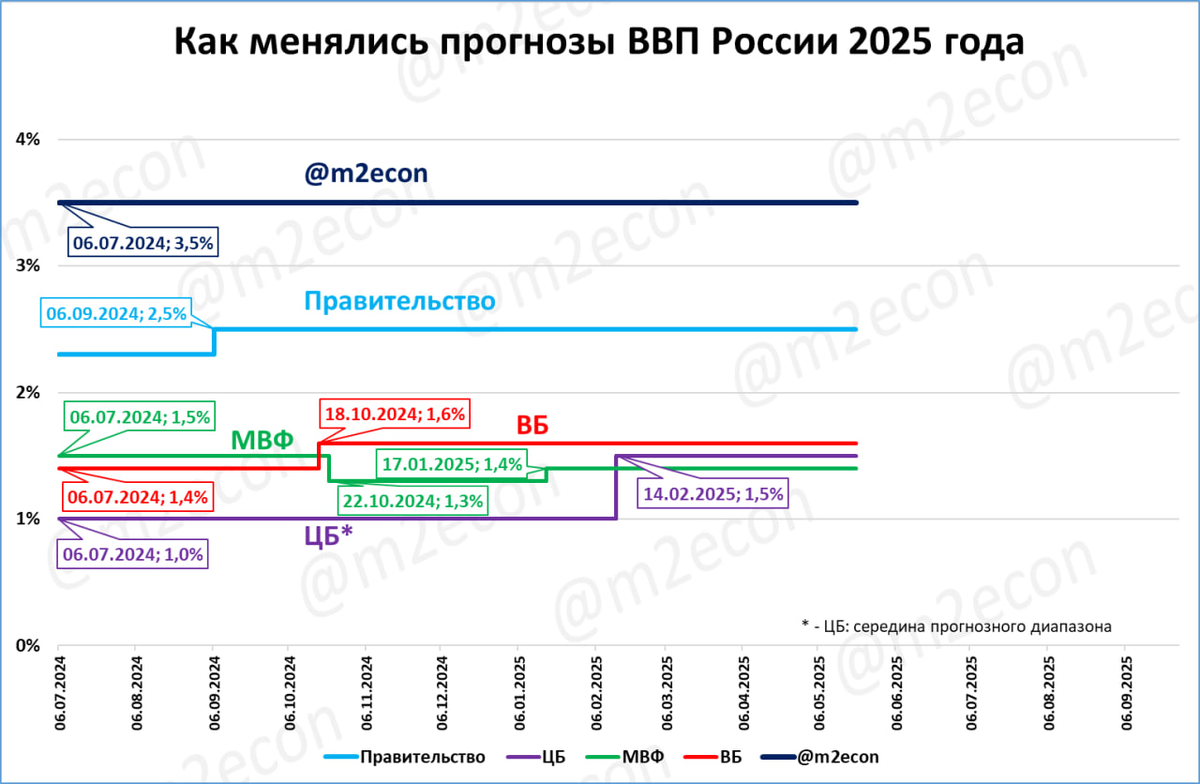 Апрель — традиционный месяц обновления прогнозов. Правительственный прогноз роста ВВП России в 2025 году остался неизменным: +2,5%.