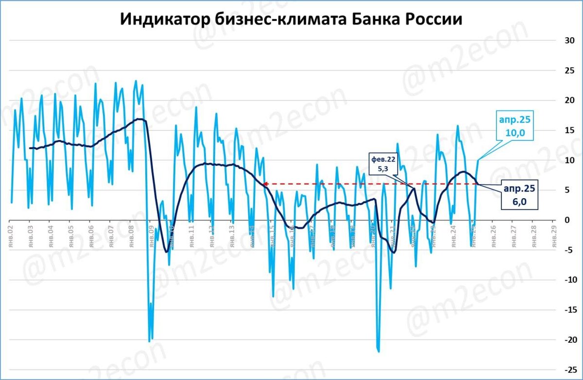 ЦБ опубликовал данные своего индикатора бизнес-климата за апрель. Мы используем исходные, несглаженные данные.
