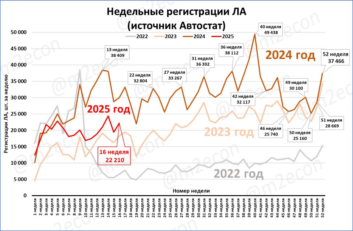 По данным агентства «Автостат», регистрации легковых автомобилей на 16 неделе составили 22,2 тыс.