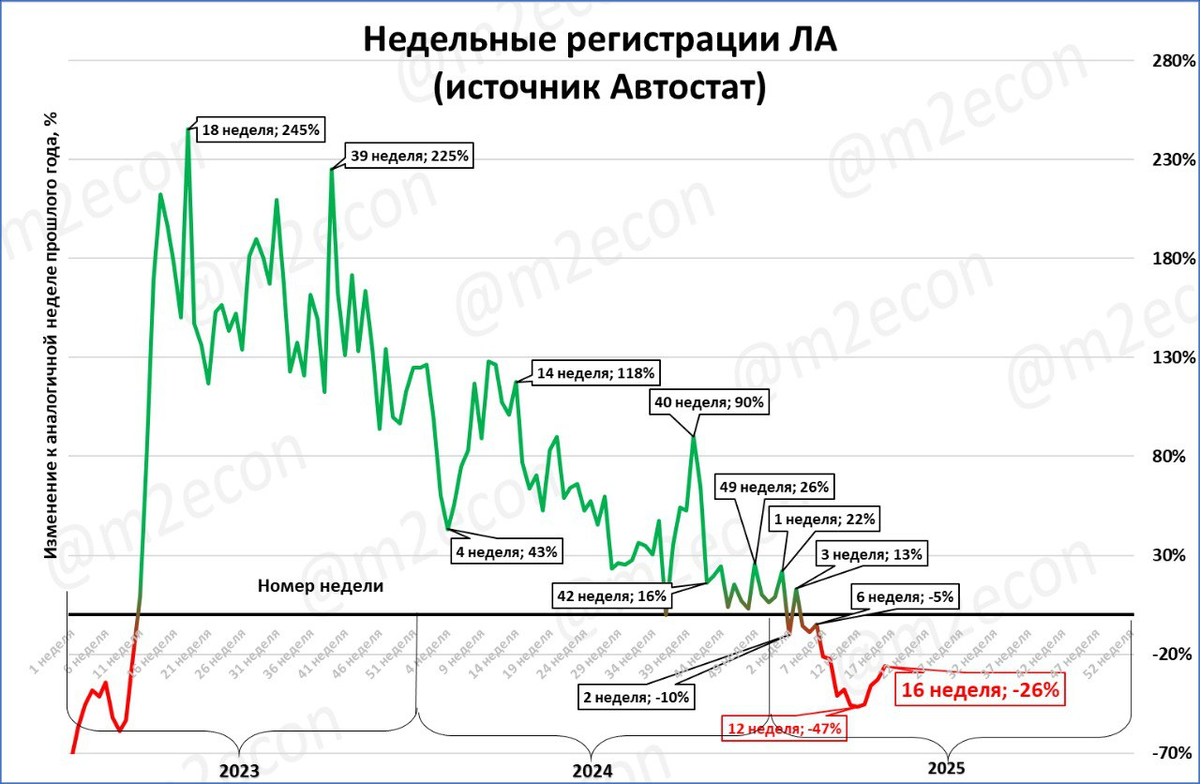 Темпы падения продолжают замедляться, максимальными они были на 12 неделе (-47%).