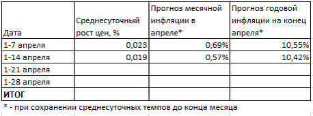 Судя по недельным данным, в апреле инфляция может составить 10,4%.