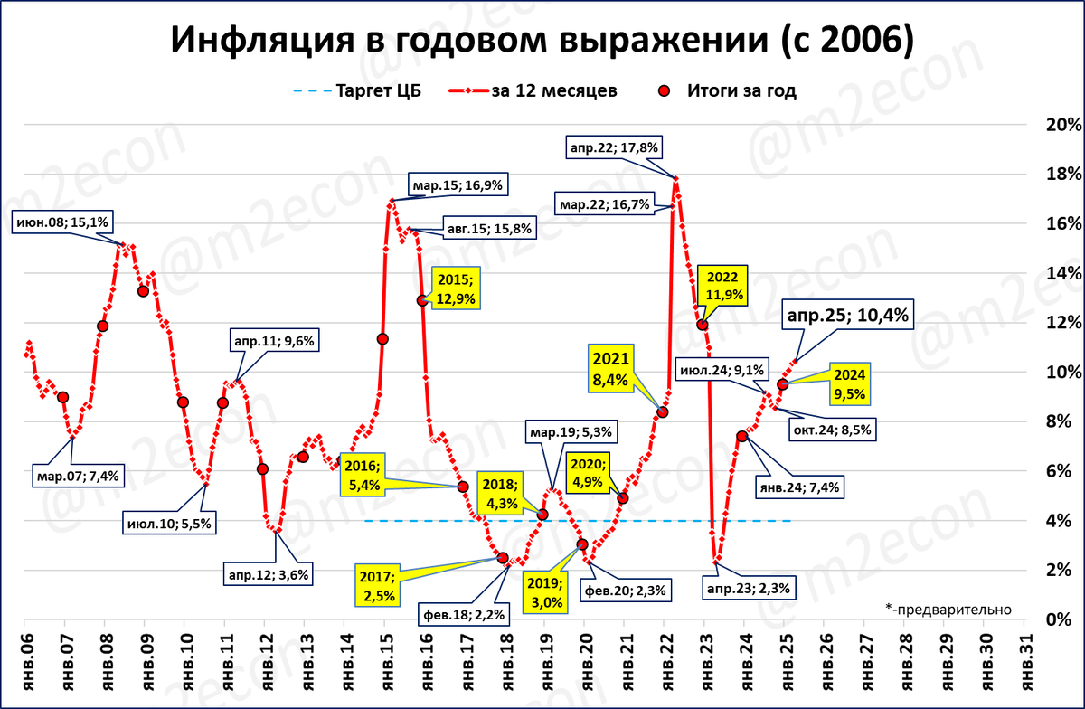 Если такой рост продлится до конца месяца, то инфляция по итогам апреля составит 10,4% годовых. Для сравнения: неделю назад апрельская инфляция ожидалась на уровне 10,6% годовых.