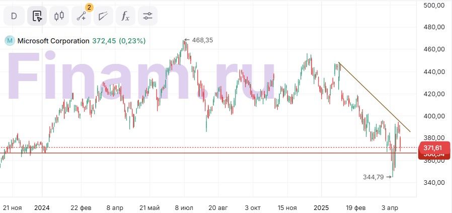 Microsoft Corporation (MSFT) — конгломерат в сфере ПО для бизнеса и частных лиц, провайдер облачной платформы Microsoft Cloud, крупнейший представитель рынка онлайн-игр. По результатам II квартала 2025 фингода совокупная выручка Microsoft достигла рекордного квартального уровня $69,6 млрд (+12% (г/г)) и превысила консенсус-прогноз Refinitiv $68,8 млрд. Однако прослеживается замедление роста, так как в предыдущие кварталы подъем составлял более 15%. Прогноз по выручке на III квартал 2025 фингода компания снизила c $69,8 млрд до $67,7–68,7 млрд.