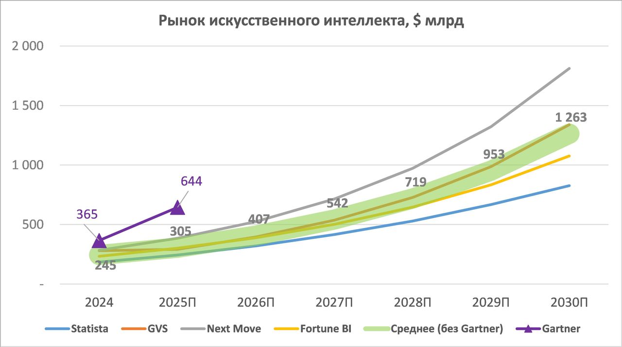 - Оценки объема рынка искусственного интеллекта (ИИ) в 2025 году достигли $644 млрд. Это более чем вдвое выше прежних прогнозов. К 2030 году рынок вырастет до $1,3 трлн.