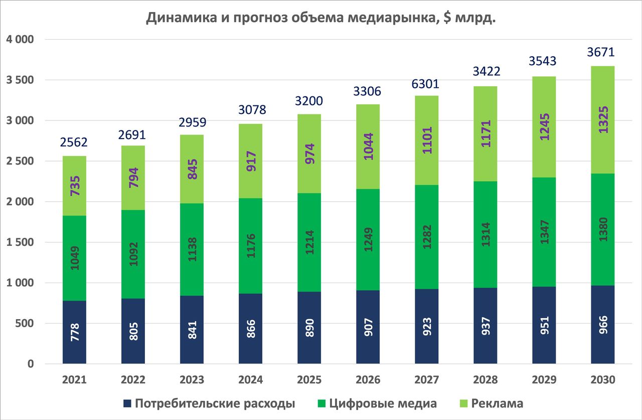 Генеративный ИИ трансформирует медийный бизнес и в первую очередь — рекламный. Объем рынка медиа и развлечений (E&M) в 2024 году, по данным PwC, составил $2,959 трлн, в 2025 году он вырастет до $3,078 трлн, а в 2028 году — до $3,422 трлн. Средние темпы прироста за этот период составят 3,9%. Более высоких темпов — на уровне 7,7% в год — ожидают аналитики The Business Research Company, согласно которым объем медиарынка в 2024 году составил $2,617 трлн, в 2025 году он достигнет $2,833 трлн, а в 2029 году увеличится до $3,815 трлн. Данные и прогнозы этих источников проэкстраполированы нами до 2030 года, когда, по нашим ожиданиям, объем рынка составит $3,671 трлн.
