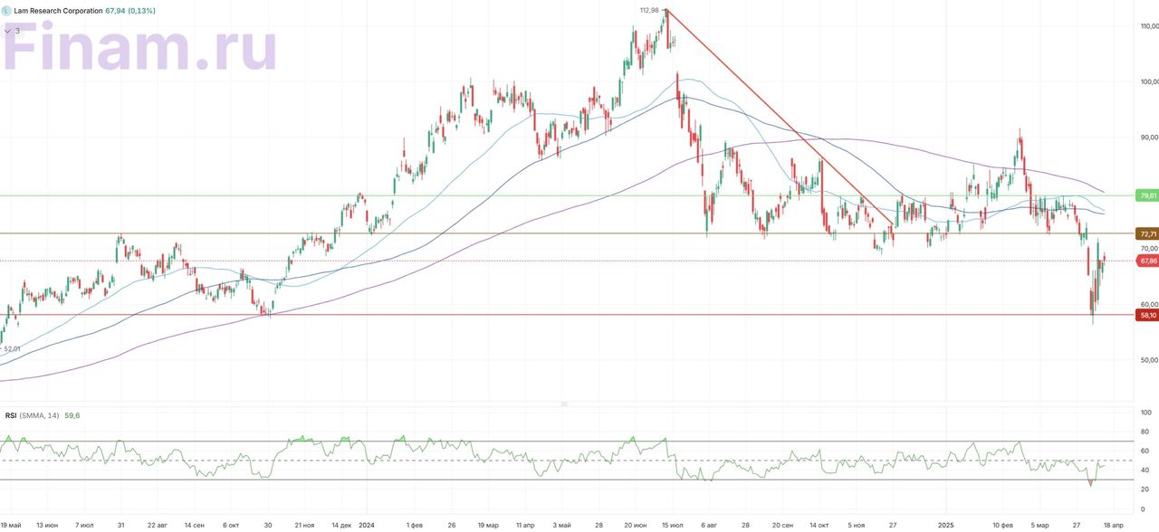 Компания продолжает снижать зависимость от китайского рынка, на долю которого во II финквартале пришлось 31% выручки по сравнению с 37% кварталом ранее. Одновременно укрепляются позиции Lam Research в других регионах Азии, включая Корею, Тайвань и Юго-Восточную Азию. В III финквартале ожидается дальнейшее улучшение результатов: выручка может достичь $4,65 млрд (+6,1% (г/г)), а EPS — $1,0 (+9,9% (г/г)). Валовая маржа, согласно прогнозу менеджмента, вырастет до 48,0%. Основным риском для компании остаются новые экспортные ограничения со стороны США, способные затронуть до $700 млн выручки в 2025 году. Кроме того, введенные торговые пошлины могут оказать давление на рентабельность бизнеса Lam Research, поэтому не исключаем, что менеджмент пересмотрит прогноз на 2025 год в сторону понижения.