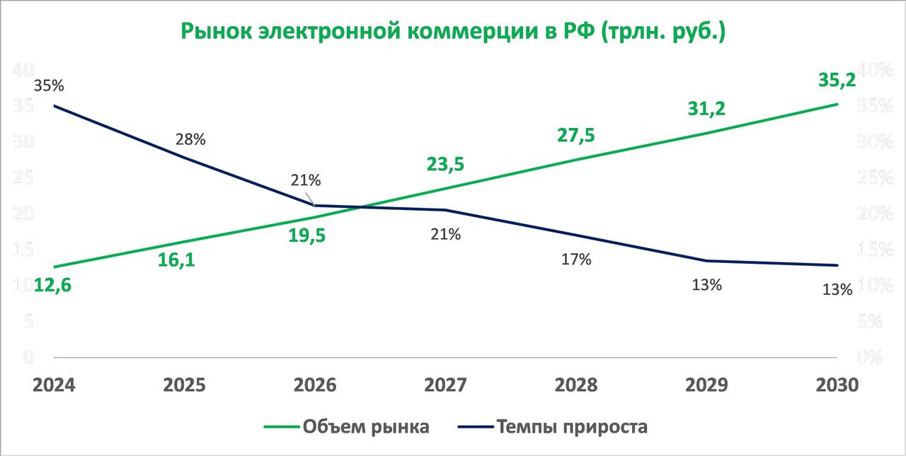 Доля товаров и услуг, проданных на маркетплейсах (Wildberries, Ozon, «Яндекс.Маркет», «Сбер» и т.п.) составляет 64% от всего объема онлайн-торговли. В базовом сценарии компании «Яков и Партнеры» объем отечественного рынка электронной коммерции к 2030 году вырастет в 2,6 раза и достигнет 32,3 трлн руб., в двух менее консервативных сценариях — 35,2 трлн руб.