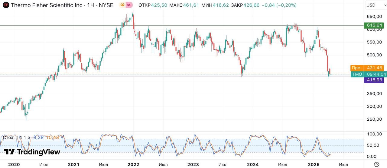 Данная картина не выглядит оправданной с фундаментальной точки зрения — Thermo Fisher попала под одну гребенку с другими представителями отрасли в ходе недавних распродаж. Мы считаем, что в силу выраженной фундаментальной недооцененности и сохраняющихся перспектив роста выручки и прибыли в 2025 году Thermo Fisher сумеет отжаться от дна и показать хороший отскок.