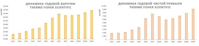 Годовая выручка Thermo Fisher Scientific демонстрировала уверенную долгосрочную восходящую динамику вплоть до 2023 года, по итогам которого произошло снижение продаж из-за сокращения эффекта ковидного направления. В 2025–2027 гг. положительная тенденция, как ожидается, возобновится.