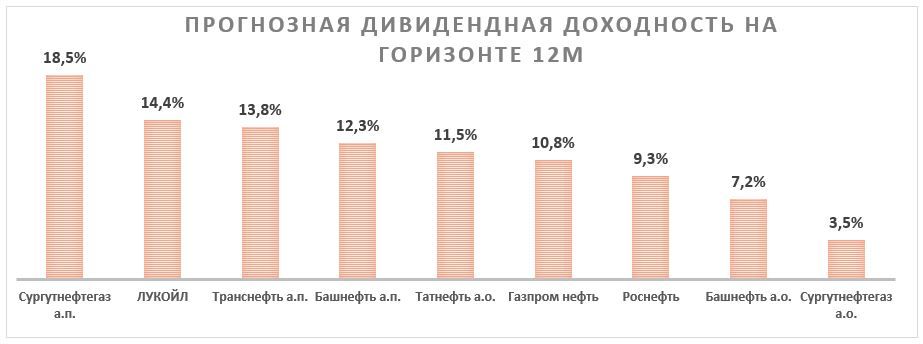 Среди более традиционных историй позитивно смотрим на акции «Лукойла». «Лукойл» в первую очередь выделяется щедрой дивидендной политикой, предусматривающей выплату 100% скорректированного свободного денежного потока в виде дивидендов. По нашим оценкам, на фоне сильной генерации FCF даже в условиях волатильной конъюнктуры дивиденды «Лукойла» на горизонте 12 месяцев могут составить около 970 руб. на акцию, что соответствует 14,4% доходности.