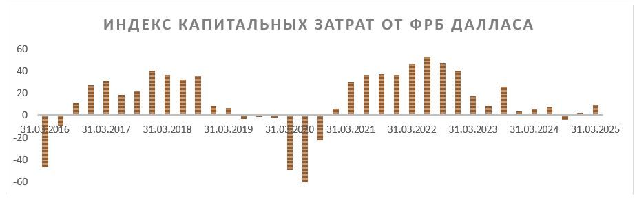 Во-вторых, пока сентимент среди американских представителей нефтегаза относительно планов по капитальным расходам выглядит нейтрально. Значение индекса капитальных затрат, формирующегося на основе опроса ФРБ Далласа крупнейших нефтегазовых компаний одного из округов Техаса, в первом квартале составило 9,4 пункта. Значение выше нуля означает позитивный настрой компаний относительно объема инвестиций, а ниже нуля — отрицательный. Иначе говоря, в марте настрой нефтяников из ключевого для США нефтедобывающего региона был умеренно положительный. В то же время отметим, что Baker Hughes, крупнейшая нефтесервисная компания в мире, ожидает, что в 2025 году мировые затраты на разведку и добычу могут снизиться в пределах 7-9% (г/г).