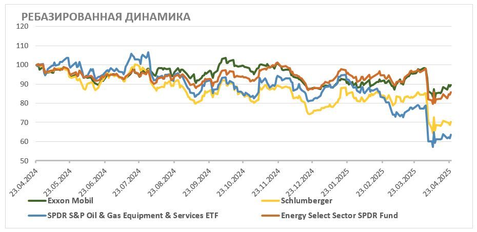 В-третьих, после коррекции оценка ряда представителей сектора выглядит привлекательно даже с учетом вероятного ухудшения финансовых результатов во II полугодии 2025 года. В частности, мы выделяем акции Schlumberger, которые после коррекции оцениваются всего в 6,2 EV/EBITDA 2025E.