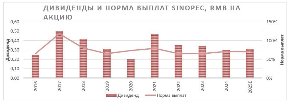 На наш взгляд, Sinopec в первую очередь интересна достаточно высокими для китайского рынка выплатами акционерам. Стратегия компании предусматривает направление 75% прибыли на дивиденды и обратный выкуп акций. По нашим оценкам, на горизонте 12 месяцев размер выплат может оставить около 0,30 RMB на акцию, что соответствует 8,1% доходности — привлекательное для сектора значение. Кроме того, в последние годы Sinopec проводит обратный выкуп акций. В последние кварталы компания выкупала акции на 0,8-1,5 млрд RMB, что соответствует 0,1-0,2% доходности за квартал.