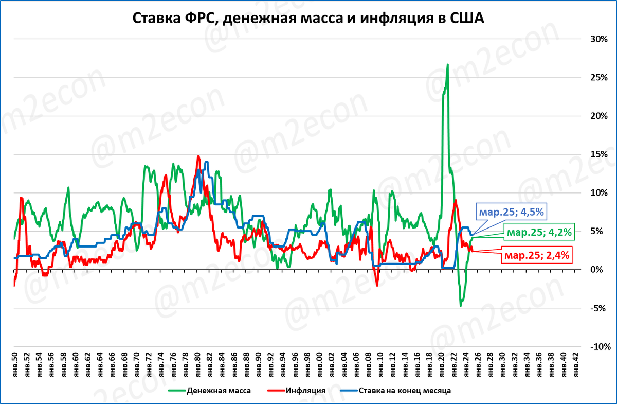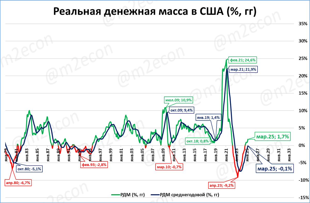 Денежная масса в США по итогам марта выросла на 4,2%. Четвёртый месяц она растет быстрее цен (= растёт в реальном выражении). Сжатие реальной денежной массы (РДМ), продолжавшееся до этого 29 месяцев подряд, закончилось.