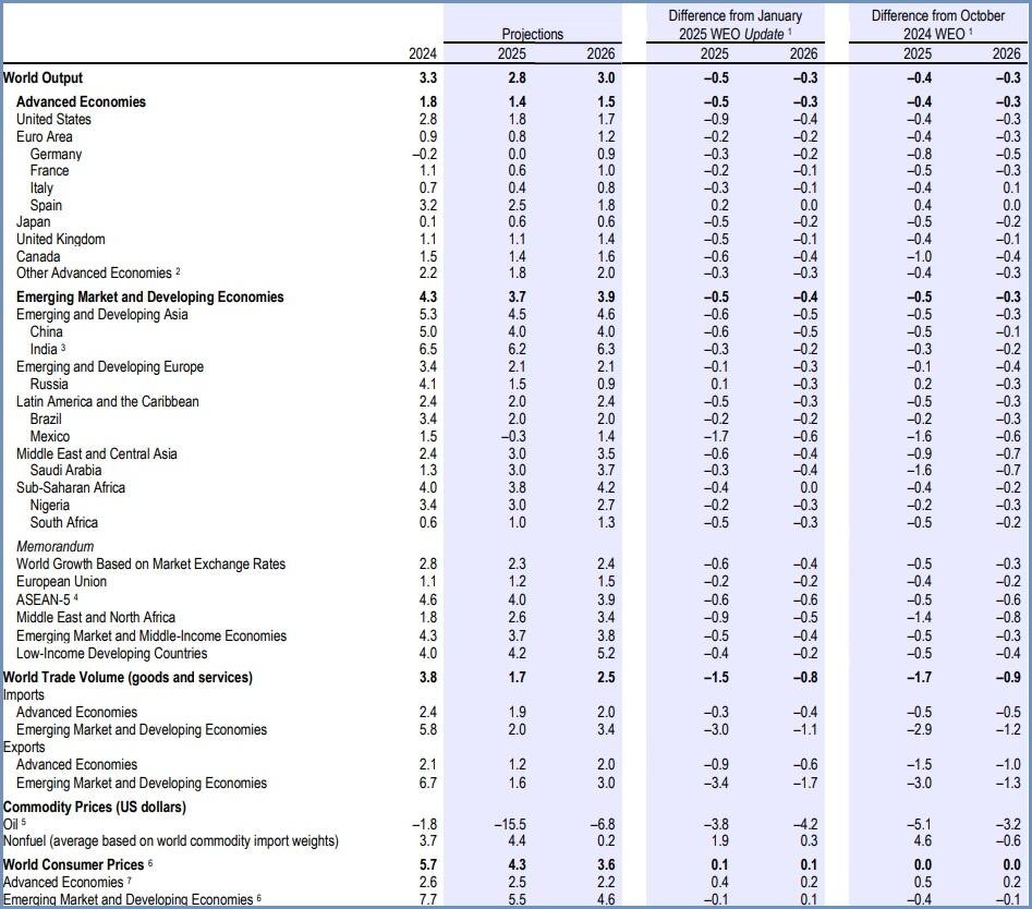 По сравнению с предыдущим прогнозом МВФ (январь 2025) прогноз по мировой экономике в целом ухудшен и на 2025 год (на 0,5 процентного пункта), и на 2026-й (на 0,3 п.п.).