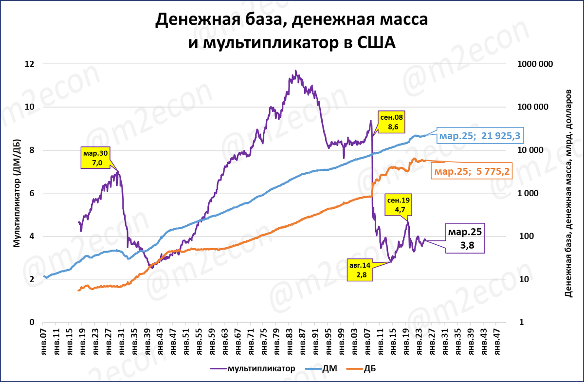 Отношение денежной массы к денежной базе в США (это и есть мультипликатор) в ходе многочисленных раундов количественного смягчения в 2008-2013 годах и ещё одного гигантского смягчения в 2020 году снизилось до 4.